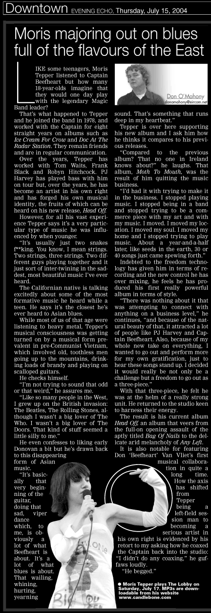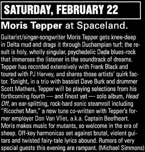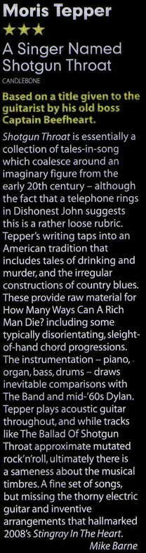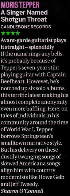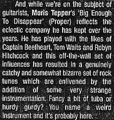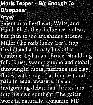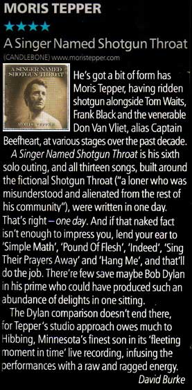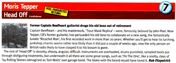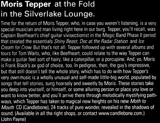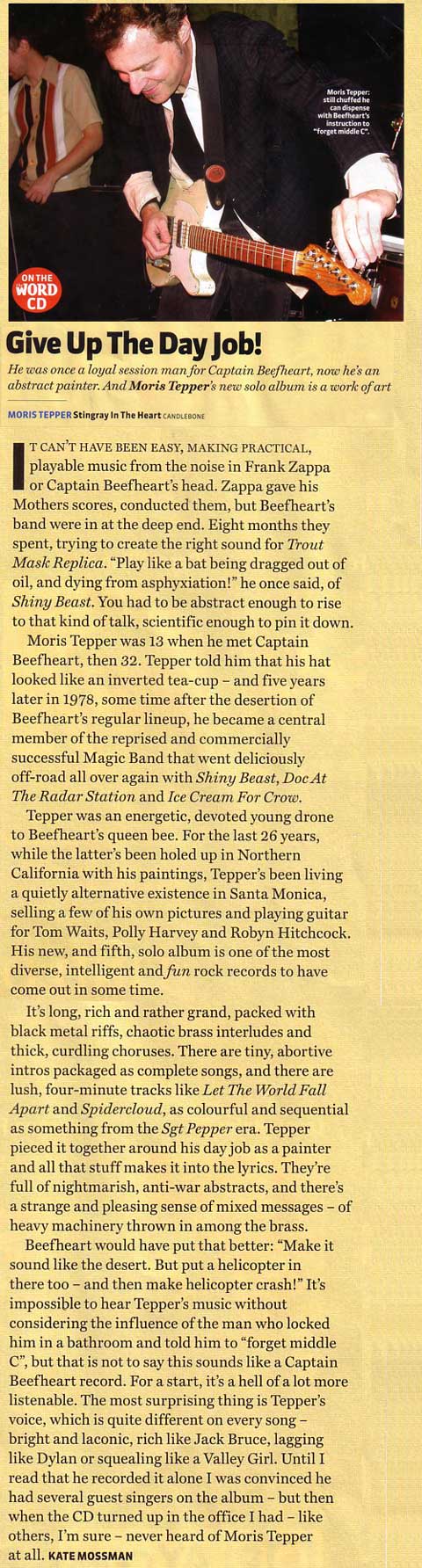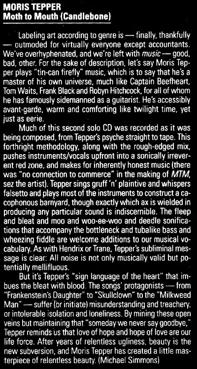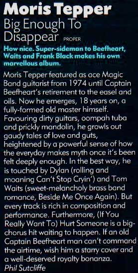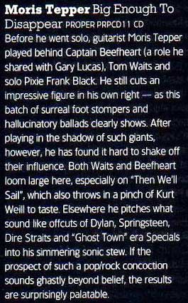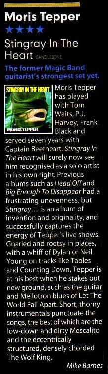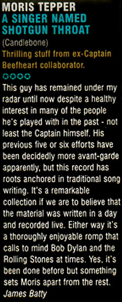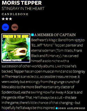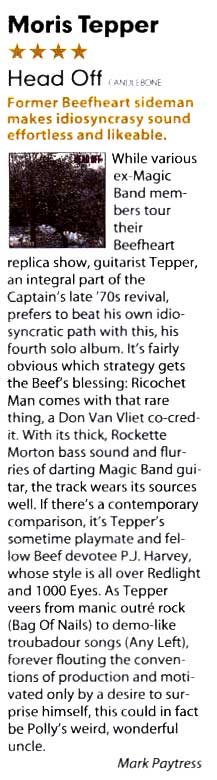 From MOJO Magazine: 'Stingray In The Heart' Review, 2008:![]() From Q Magazine: 'Stingray In The Heart' Review, 2008:![]() MORIS TEPPER : HEAD OFF [back to top]![]() From MOJO Magazine: 'Head Off' Review, 2004:![]() From Ireland’s Evening Echo: 'Head Off' Review, July 15, 2004:![]() Pitchfork Media 'Head Off' Review, September 23, 2004:Moris Tepper Head off by Johnny LoftusMoris Tepper proves a chameleon on Head Off, taking on and turning out the traditions of folk, blues, and brash, bleating exploration. Multiple avenues and dusty dirt roads intersect with Tepper’s muse, which is fitting for a guy who played guitar with Captain Beefheart on Bat Chain Puller and has gone on to collaborations with types like Frank Black and Robyn Hitchcock. Head Off takes its time exploring those roads and avenues, guided at all times by Tepper’s soulful groan, which itself transforms from Waitsian mutter (another past collaborator) to crumpled speaker cone whinny with steady-as-he-goes regularity. The result is a record that threatens to ramble but rarely does, and tempers its moves toward mature singer/songwriter territory with a handful of busted, freaky, and lurching howls. Lots of things come to mind during this flickering filmstrip. "The Sky Was Grey" is a few brief frames of plaintive, treated guitar and space-age sound effects, reflecting the shadowy new-century gothic of Jim White. Then there’s "Ricochet Man", which, co-written with Mr. Don Van Vliet himself, offers two minutes of scatterbrained six-string, clattering, tumbling rhythms, and homemade vocal reverb. Here, all of a sudden, Head Off approaches the battered downtown sounds of Beefheart descendents Skeleton Key; Tepper holds it all together with an evocative vocal, and characters rendered just enough for us to imagine the scene. We might not know exactly what the Ricochet Man’s going to do for us, but if his gifts are as potent as the song, then an ether bender isn't a far-flung possibility. It’s this sharp songcraft that keeps the album’s various parts rolling more or less succinctly down the pavement. While tense opener "Bag of Nails" seems sheared off the Pacific Northwest’s noisier side, the resulting title track is a robust psychedelic country rocker led by harmonica and robust acoustic guitars. "Why don't you stop thinking about it and take your head off?" Tepper says, and it’s good advice as the album rolls on. "Mrs. Bodean" tells a tale of bad blood and horse’s bones; there’s some morbid, sordid shit happening in its out-of-the-way places, but the tale unfolds on a melody full of both sadness and hope. There are no real facts, only clues left behind, but they're enough for some provisions and gas, to get us through Head Off’s at once shuddering and graceful final act. The aptly-named "Sourpuss" and its accompanying "Fast One" mark the manic, noisier side of Tepper that the earlier "Ricochet Man" shakily pointed to. "There’s a banging in my head like there’s something loose," he sings, as the electric guitars make sounds like chiggers and the percussion stomps and crashes. "Fast" employs loops and layered vocal personas from Tepper to suggest the disjointed thought process inside that broken brain. Still, as with the rest of Head Off, these exploratory pieces are played off gentle, evening-fire acoustic tracks. "Any Left" is one of these: Its coals fade to black shortly after it starts, but then a scratchy calliope whirs to life, taking Head Off out on a wistful, black and white note. It’s like finding footage of fair goers dancing on the Midway at World’s Columbian Exposition of 1893. Head Off might not bring everyone the same sort of imagery, but it will keep you guessing, and that trait is pure gold in Frownland. From NME Magazine: 'Head Off' Review, 2004:![]() MORIS TEPPER : MOTH TO MOUTH [back to top]![]() The L.A. Weekly from 18 August 2000 had this to say:![]() MORIS TEPPER : BIG ENOUGH TO DISAPPEAR [back to top]![]() From Britian’s Mojo Magazine, the July 2000 issue had these words:![]() From Birmingham’s What’s On:![]() From Classic Rock, August 2000:![]() From U.K.’s The Wire, July 2000:![]() MUSICIAN September 1995 Reviews Jon Young "Attention all lazy A&R people: Anybody who wants to "discover" a swell artist with a minimum of effort should check out Moris Tepper’s debut album now. It’s familiar in an appealing way, echoing sensitive but manly men like Mellencamp or Springsteen without resorting to imitation. For artier types it’s got a seriously zany streak, reflecting his stints as guitarist for such celebrated mavericks as Captain Beefheart and Tom Waits, but avoids gratuitous weirdness. From either angle, this deceptively slick gem crackles with more wit and vitality than most of the well-financed product cluttering the racks today, capturing the contagious joy of an inventive soul at play. The dude dazzles from the git-go. Tepper routinely carries standard situations to tragicomic extremes. Canny arrangements are Tepper’s secret weapon. In addition to goofy horns, he spices the mix with marimbas, accordions, concertinas, banjos and the like, recalling the chunky textures of the Band. The romantic tunes are so genuinely poignant that his odder stuff seems truly warped by comparison. Even at his most melodramatic, Tepper never fails to rant with authority. Everything makes sense in its own eccentric way." OPTION November/December 1995 Reviews David Shirley "Tepper makes an extremely impressive debut as a singer/songwriter. ....He brings a lighter and gentler touch to songs like "Done Wrong" and "If You Really Want To Hurt Someone," a jangling, accordion-driven ballad that could jump start Rod Stewart’s career. Even better is the opening cut, "Can't Stop Cryin'," a galloping, paranoid tale of heartache and ruin." HIGH TIMES December 1995 Discs Chuck Crisafulli "Tepper’s tunes are as beautiful and powerful as they are crazy and playful, but possessing undeniable emo