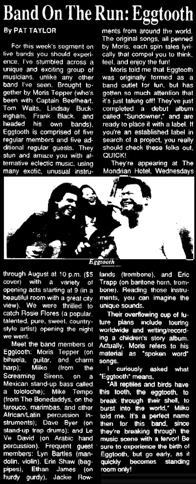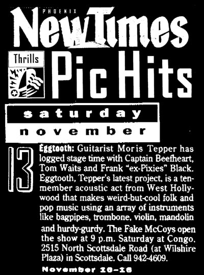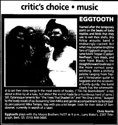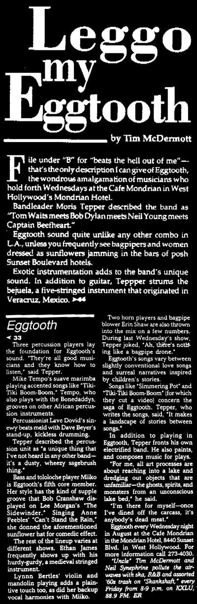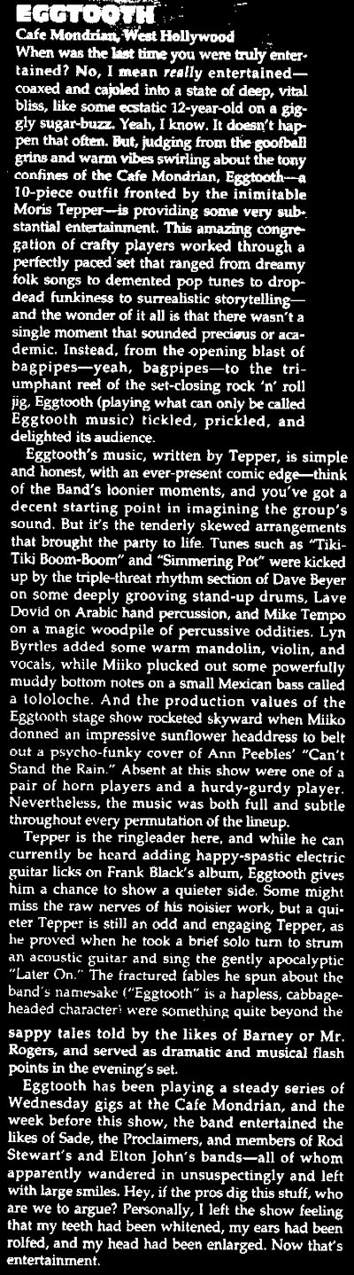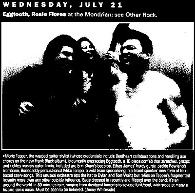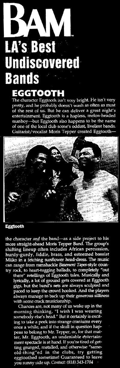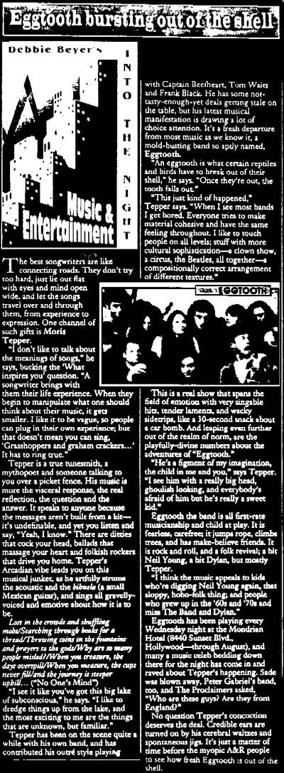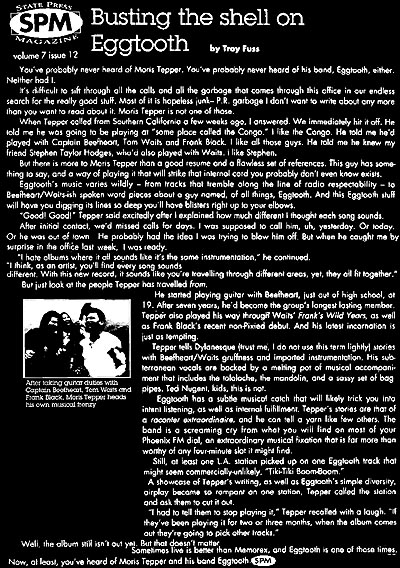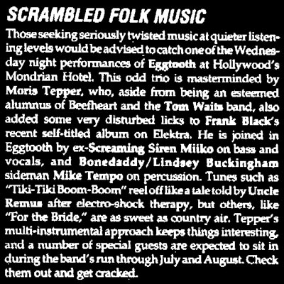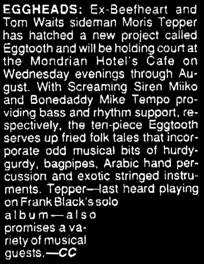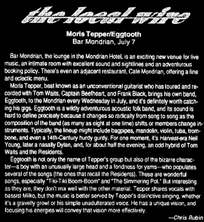 From MOJO Magazine: 'Stingray In The Heart' Review, 2008:![]() From Q Magazine: 'Stingray In The Heart' Review, 2008:![]() MORIS TEPPER : HEAD OFF [back to top]![]() From MOJO Magazine: 'Head Off' Review, 2004:![]() From Ireland’s Evening Echo: 'Head Off' Review, July 15, 2004:![]() Pitchfork Media 'Head Off' Review, September 23, 2004:Moris Tepper Head off by Johnny LoftusMoris Tepper proves a chameleon on Head Off, taking on and turning out the traditions of folk, blues, and brash, bleating exploration. Multiple avenues and dusty dirt roads intersect with Tepper’s muse, which is fitting for a guy who played guitar with Captain Beefheart on Bat Chain Puller and has gone on to collaborations with types like Frank Black and Robyn Hitchcock. Head Off takes its time exploring those roads and avenues, guided at all times by Tepper’s soulful groan, which itself transforms from Waitsian mutter (another past collaborator) to crumpled speaker cone whinny with steady-as-he-goes regularity. The result is a record that threatens to ramble but rarely does, and tempers its moves toward mature singer/songwriter territory with a handful of busted, freaky, and lurching howls. Lots of things come to mind during this flickering filmstrip. "The Sky Was Grey" is a few brief frames of plaintive, treated guitar and space-age sound effects, reflecting the shadowy new-century gothic of Jim White. Then there’s "Ricochet Man", which, co-written with Mr. Don Van Vliet himself, offers two minutes of scatterbrained six-string, clattering, tumbling rhythms, and homemade vocal reverb. Here, all of a sudden, Head Off approaches the battered downtown sounds of Beefheart descendents Skeleton Key; Tepper holds it all together with an evocative vocal, and characters rendered just enough for us to imagine the scene. We might not know exactly what the Ricochet Man’s going to do for us, but if his gifts are as potent as the song, then an ether bender isn't a far-flung possibility. It’s this sharp songcraft that keeps the album’s various parts rolling more or less succinctly down the pavement. While tense opener "Bag of Nails" seems sheared off the Pacific Northwest’s noisier side, the resulting title track is a robust psychedelic country rocker led by harmonica and robust acoustic guitars. "Why don't you stop thinking about it and take your head off?" Tepper says, and it’s good advice as the album rolls on. "Mrs. Bodean" tells a tale of bad blood and horse’s bones; there’s some morbid, sordid shit happening in its out-of-the-way places, but the tale unfolds on a melody full of both sadness and hope. There are no real facts, only clues left behind, but they're enough for some provisions and gas, to get us through Head Off’s at once shuddering and graceful final act. The aptly-named "Sourpuss" and its accompanying "Fast One" mark the manic, noisier side of Tepper that the earlier "Ricochet Man" shakily pointed to. "There’s a banging in my head like there’s something loose," he sings, as the electric guitars make sounds like chiggers and the percussion stomps and crashes. "Fast" employs loops and layered vocal personas from Tepper to suggest the disjointed thought process inside that broken brain. Still, as with the rest of Head Off, these exploratory pieces are played off gentle, evening-fire acoustic tracks. "Any Left" is one of these: Its coals fade to black shortly after it starts, but then a scratchy calliope whirs to life, taking Head Off out on a wistful, black and white note. It’s like finding footage of fair goers dancing on the Midway at World’s Columbian Exposition of 1893. Head Off might not bring everyone the same sort of imagery, but it will keep you guessing, and that trait is pure gold in Frownland. From NME Magazine: 'Head Off' Review, 2004:![]() MORIS TEPPER : MOTH TO MOUTH [back to top]![]() The L.A. Weekly from 18 August 2000 had this to say:![]() MORIS TEPPER : BIG ENOUGH TO DISAPPEAR [back to top]![]() From Britian’s Mojo Magazine, the July 2000 issue had these words:![]() From Birmingham’s What’s On:![]() From Classic Rock, August 2000:![]() From U.K.’s The Wire, July 2000:![]() MUSICIAN September 1995 Reviews Jon Young "Attention all lazy A&R people: Anybody who wants to "discover" a swell artist with a minimum of effort should check out Moris Tepper’s debut album now. It’s familiar in an appealing way, echoing sensitive but manly men like Mellencamp or Springsteen without resorting to imitation. For artier types it’s got a seriously zany streak, reflecting his stints as guitarist for such celebrated mavericks as Captain Beefheart and Tom Waits, but avoids gratuitous weirdness. From either angle, this deceptively slick gem crackles with more wit and vitality than most of the well-financed product cluttering the racks today, capturing the contagious joy of an inventive soul at play. The dude dazzles from the git-go. Tepper routinely carries standard situations to tragicomic extremes. Canny arrangements are Tepper’s secret weapon. In addition to goofy horns, he spices the mix with marimbas, accordions, concertinas, banjos and the like, recalling the chunky textures of the Band. The romantic tunes are so genuinely poignant that his odder stuff seems truly warped by comparison. Even at his most melodramatic, Tepper never fails to rant with authority. Everything makes sense in its own eccentric way." OPTION November/December 1995 Reviews David Shirley "Tepper makes an extremely impressive debut as a singer/songwriter. ....He brings a lighter and gentler touch to songs like "Done Wrong" and "If You Really Want To Hurt Someone," a jangling, accordion-driven ballad that could jump start Rod Stewart’s career. Even better is the opening cut, "Can't Stop Cryin'," a galloping, paranoid tale of heartache and ruin." HIGH TIMES December 1995 Discs Chuck Crisafulli "Tepper’s tunes are as beautiful and powerful as they are crazy and playful, but possessing undeniable emo